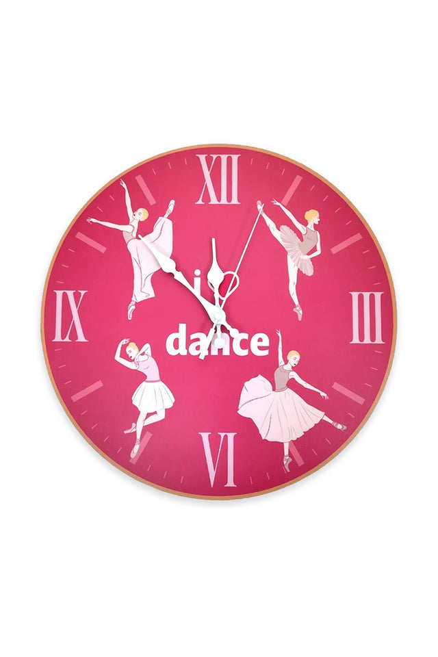 Eine hübsche rosa Wanduhr mit vier Ballerina-Illustrationen und dem Schriftzug „I ♥ Dance“. Das perfekte Geschenk für die Tänzerin in Ihrem Leben – ideal für den Einsatz im Studio, Schlafzimmer oder Büro. Betrieben mit Standard-AA-Batterien – im Lieferumfang enthalten.