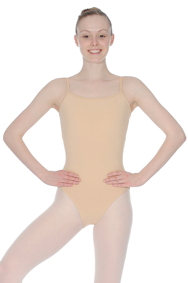 The L5607 ladies' camisole leotard from Bloch. This simple sleeveless camisole leotard is a staple in any dancer's wardrobe. Fully front lined in sand, and half bra lining in black, this modest leotard also has a classic ballet leg line for a simple yet sophisticated look.