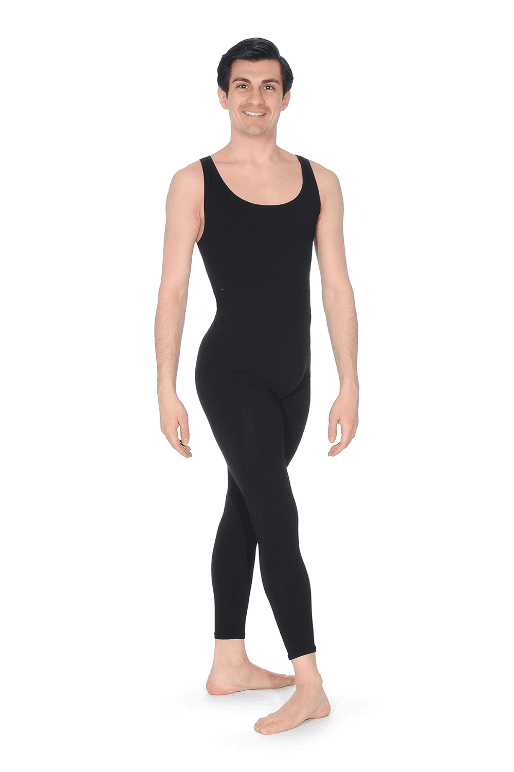 CC821 men's unitard from Capezio. Featuring a scooped neck design, this footless unitard is part of the Capezio Classics new and improved Cotton Collection. The CC821 is breathable, hard-wearing, and easily washed, making it the perfect garment for warm-ups and dance classes.