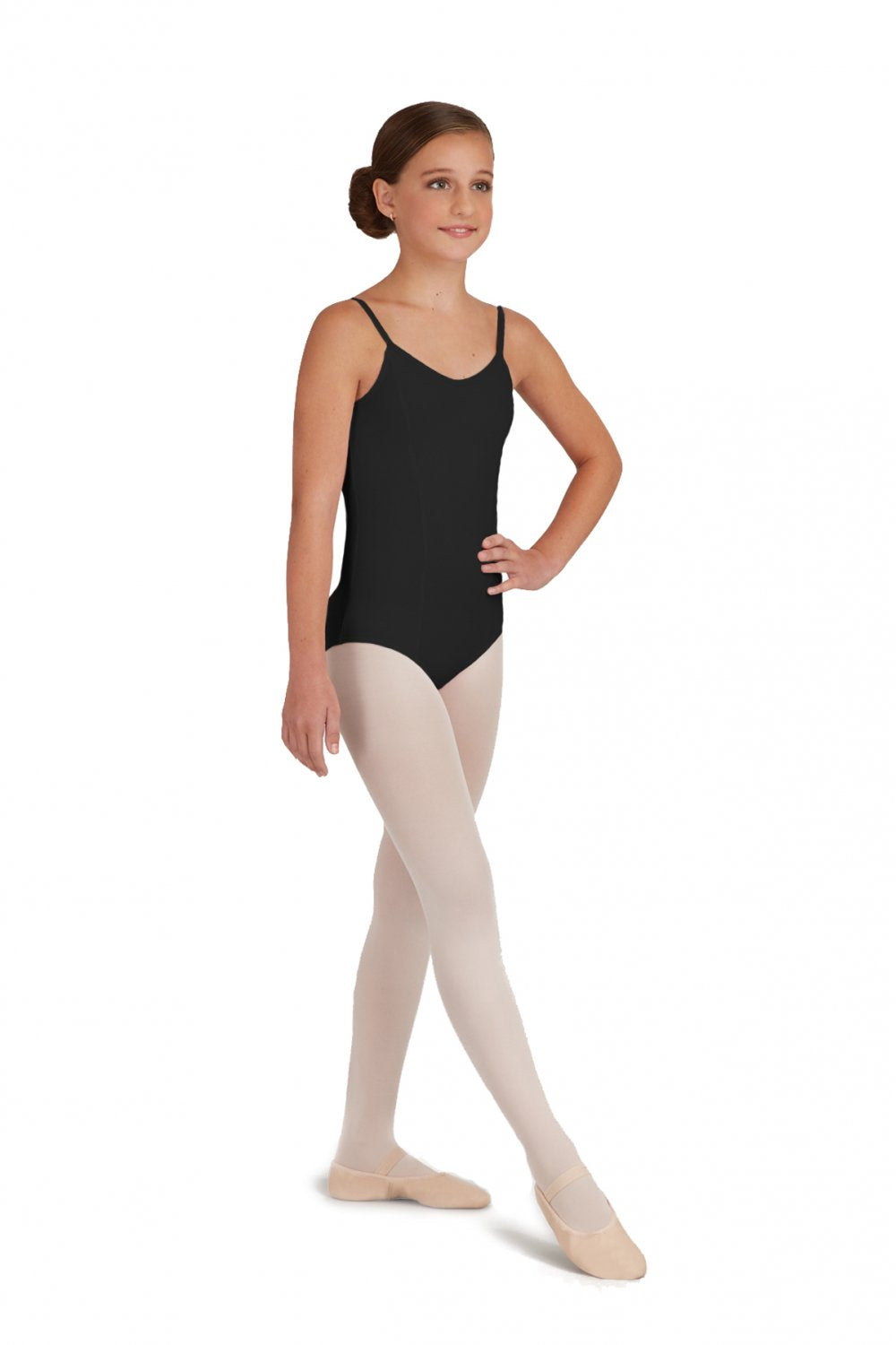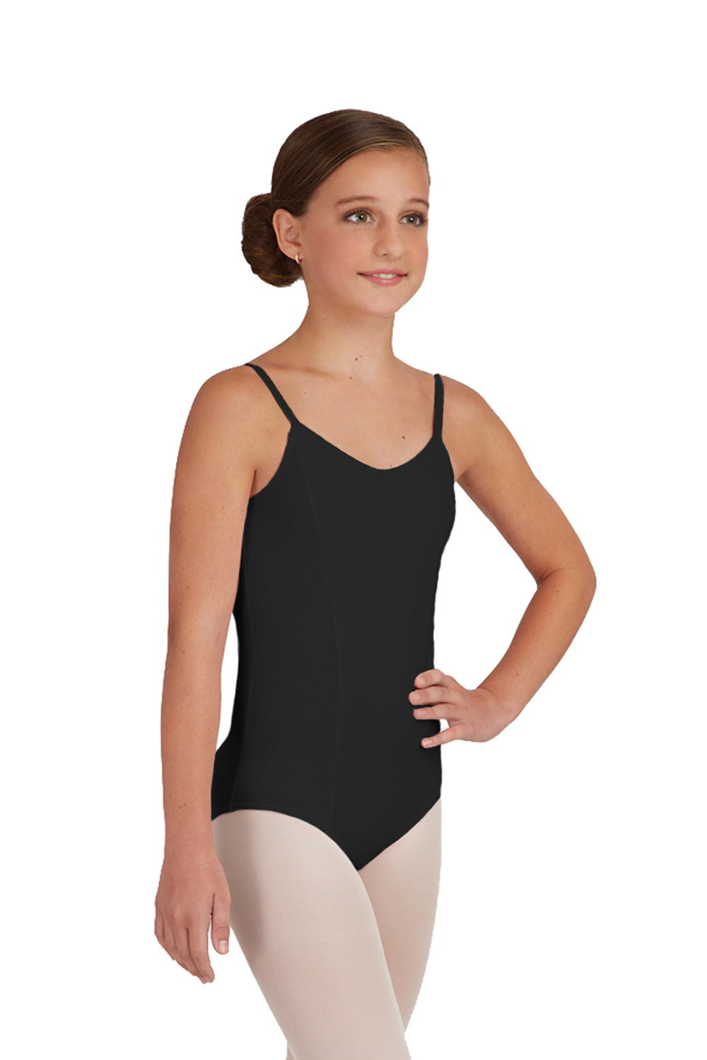 The CC101C children's camisole leotard from Capezio. This stunning girls' leotard in a classic camisole style features princess seams and a sophisticated ballet leg line. With a modest V-neck front and back and full front lining, this leotard is beautifully modest. Fabric: 90% Cotton/10% Lycra.