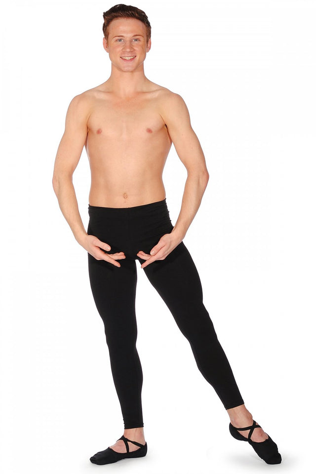 Dansez MC131 men's footless tights. Featuring a high elasticated waist for a longer leg line, the MC131 ankle length leggings are made in exclusive Cotton/Poly/Lycra fabric to ensure they will not bag at the knees. Available in a striking Black, the MC131 is highly compatible with other dance garments.
