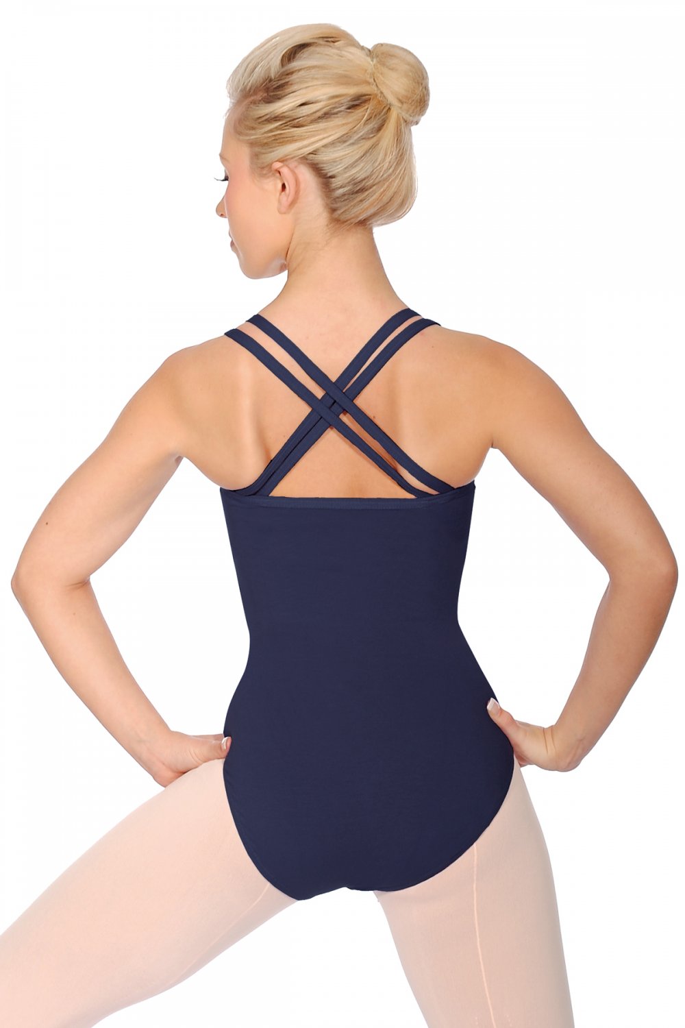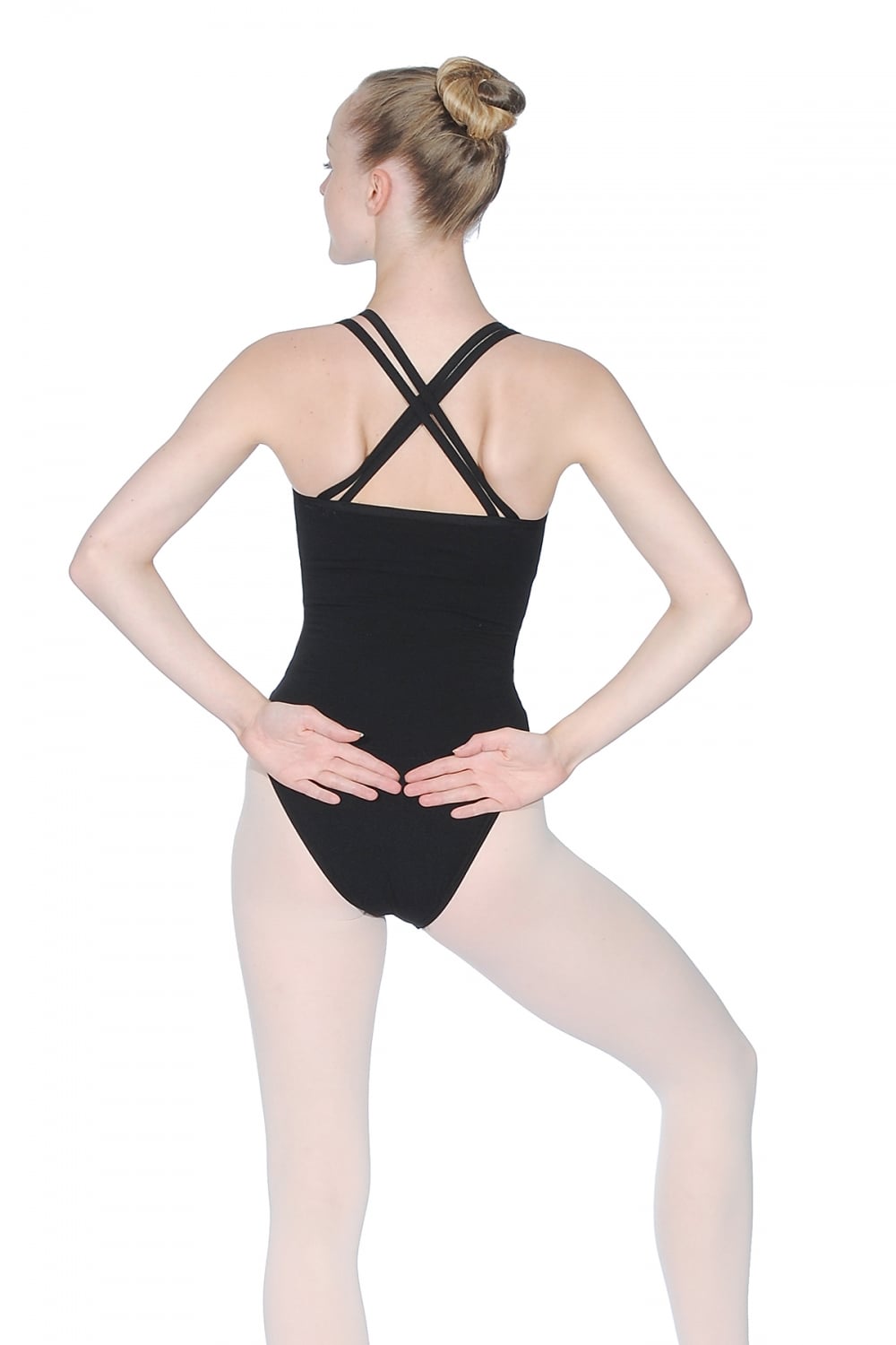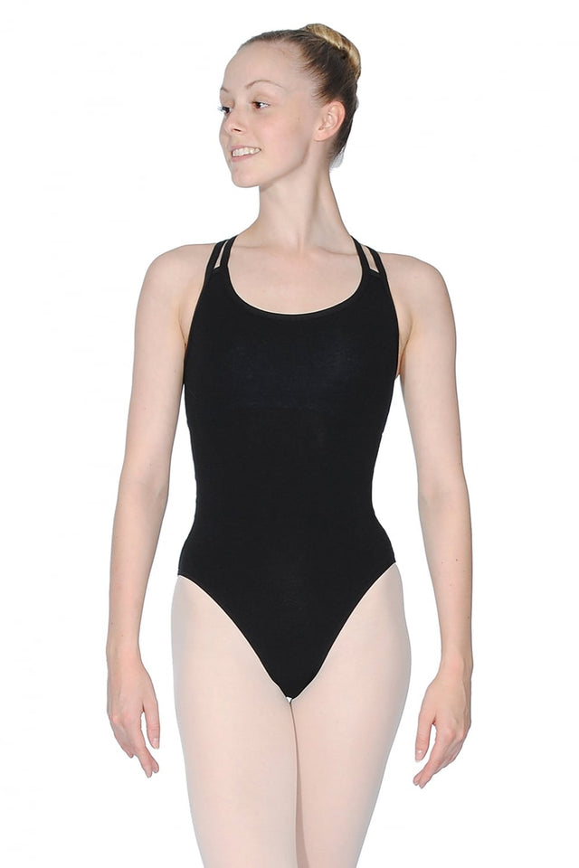 Sophie Cotton/Lycra leotard from Roch Valley. An extremely popular ladies and older student leotard, the elegant Sophie features double straps that wrap around the dancer to form a cross back. In addition, this sleeveless garment has a supportive bra shelf lining and gusset to inspire confident control.